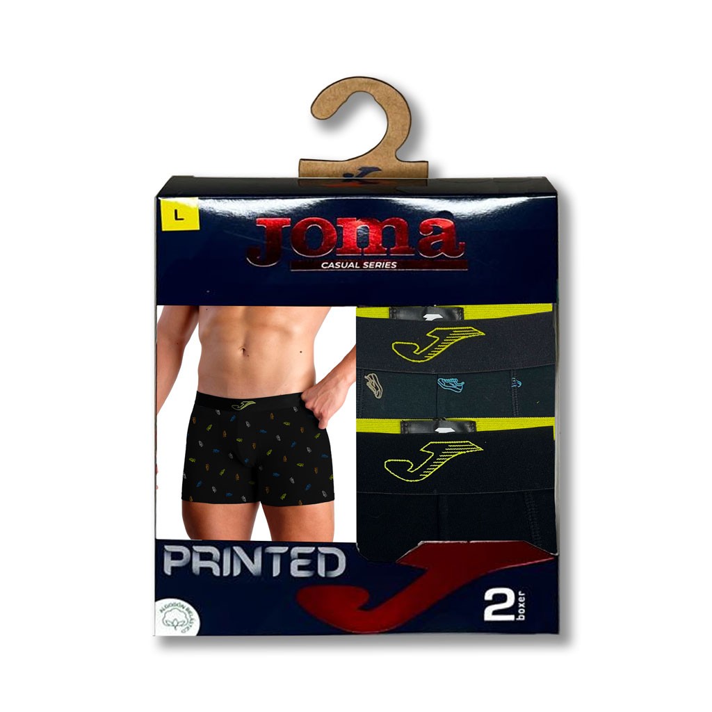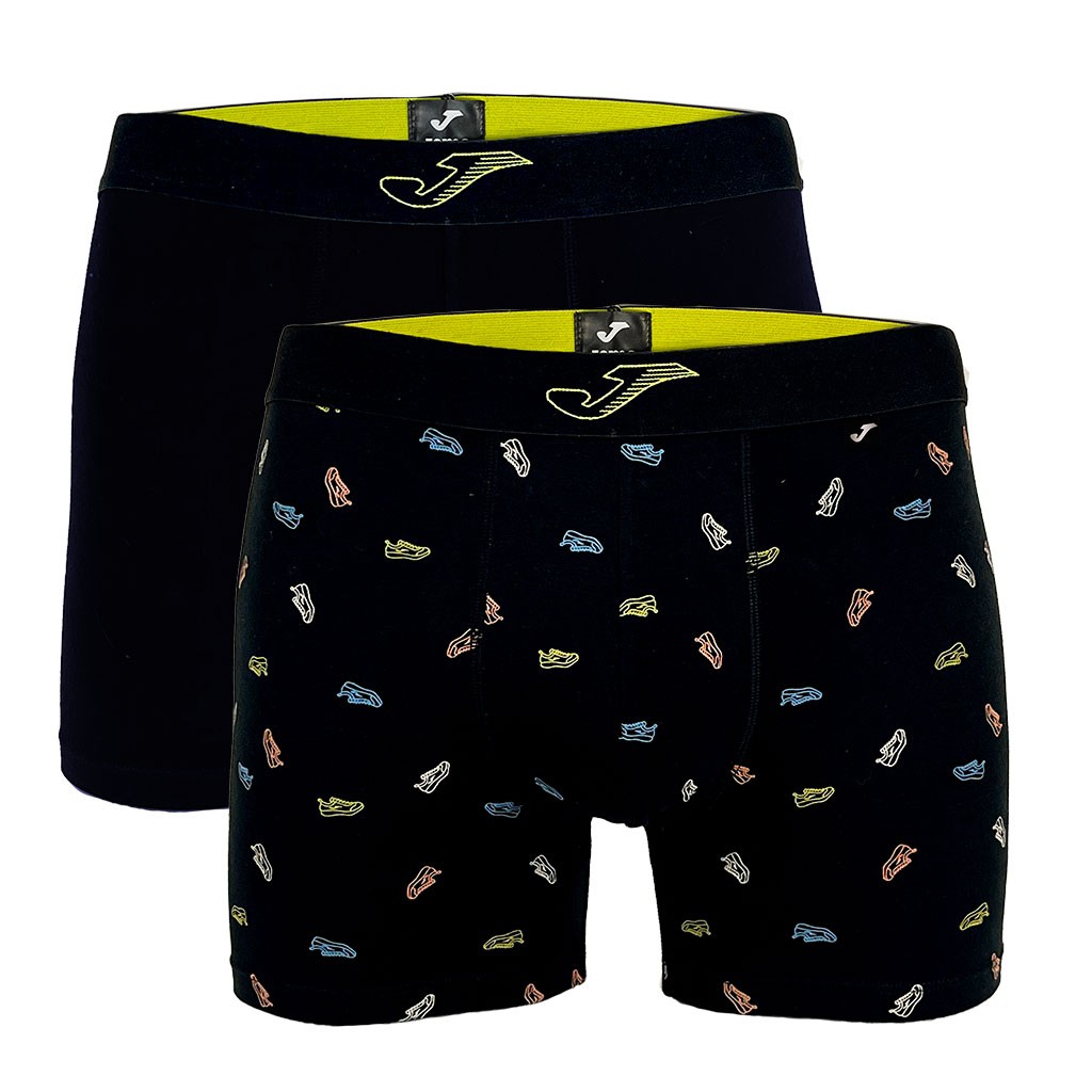 Pack de 2 bóxer de joma de algodón bielástico compuesto por un bóxer liso y otro estampado con siluetas de zapatillas en varios colores. Cintura de goma vista con logo J fluor a contraste. Se envia en caja de cartón con ventana y colgador.