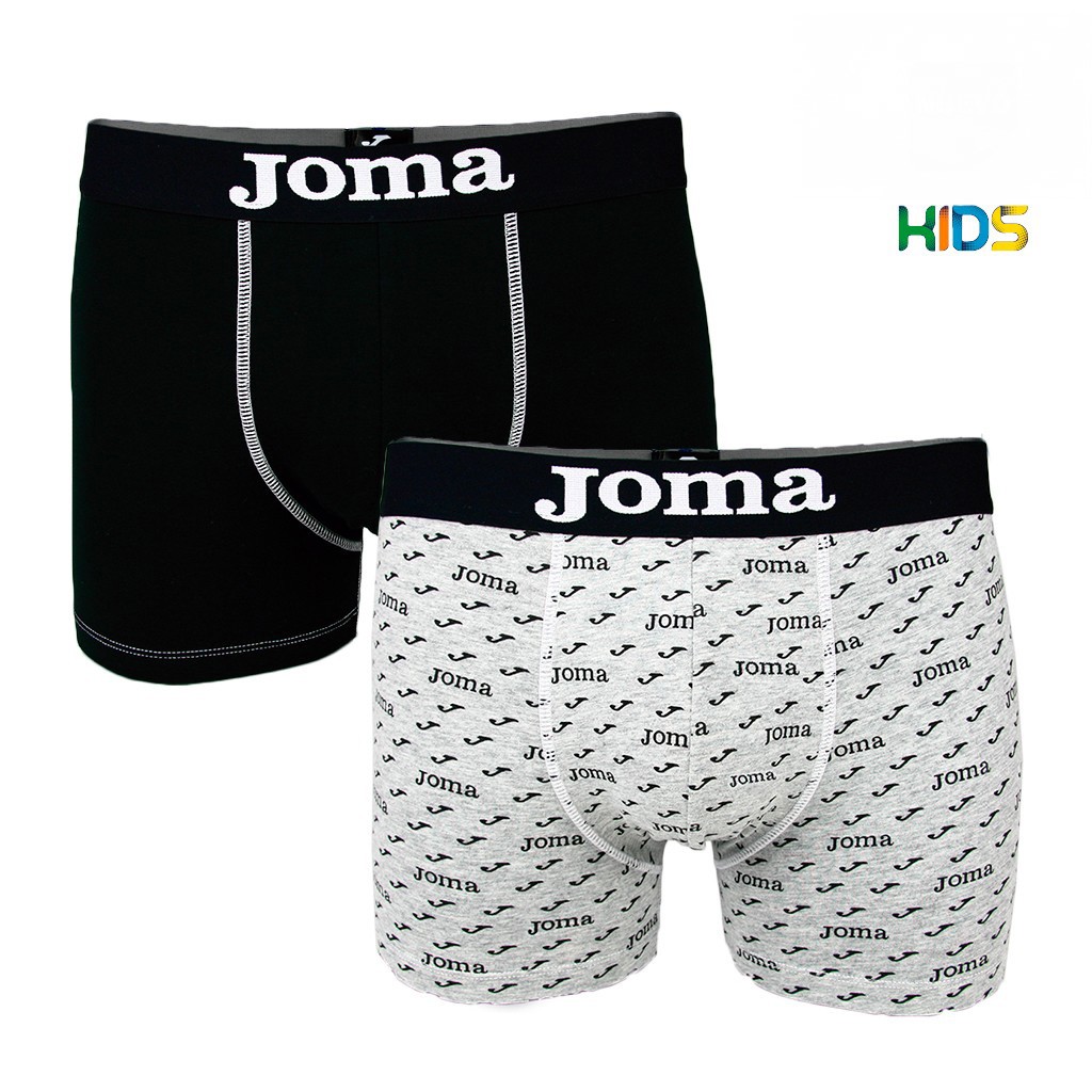 Pack de 2 bóxer deportivos para niños confeccionados en suave y elástico algodón elastano. Cada pack se compone de un boxer liso y otro estampado con una combinacion de logotipos JOMA. Se envia en nuevo blister KIDS para colgar.